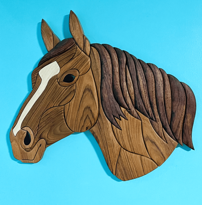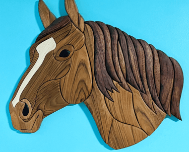 This horse piece marks my first exploration into the art of intarsia. Crafted with careful attention to grain and tone, it features a blend of Walnut, Teak, Maple, Katalox, and Cherry. Each wood was selected for its natural color and texture to bring depth and character to the horse’s expression, from the rich mane to the subtle contours of the face. This project reflects both a learning experience and a deep appreciation for the beauty of wood in art.